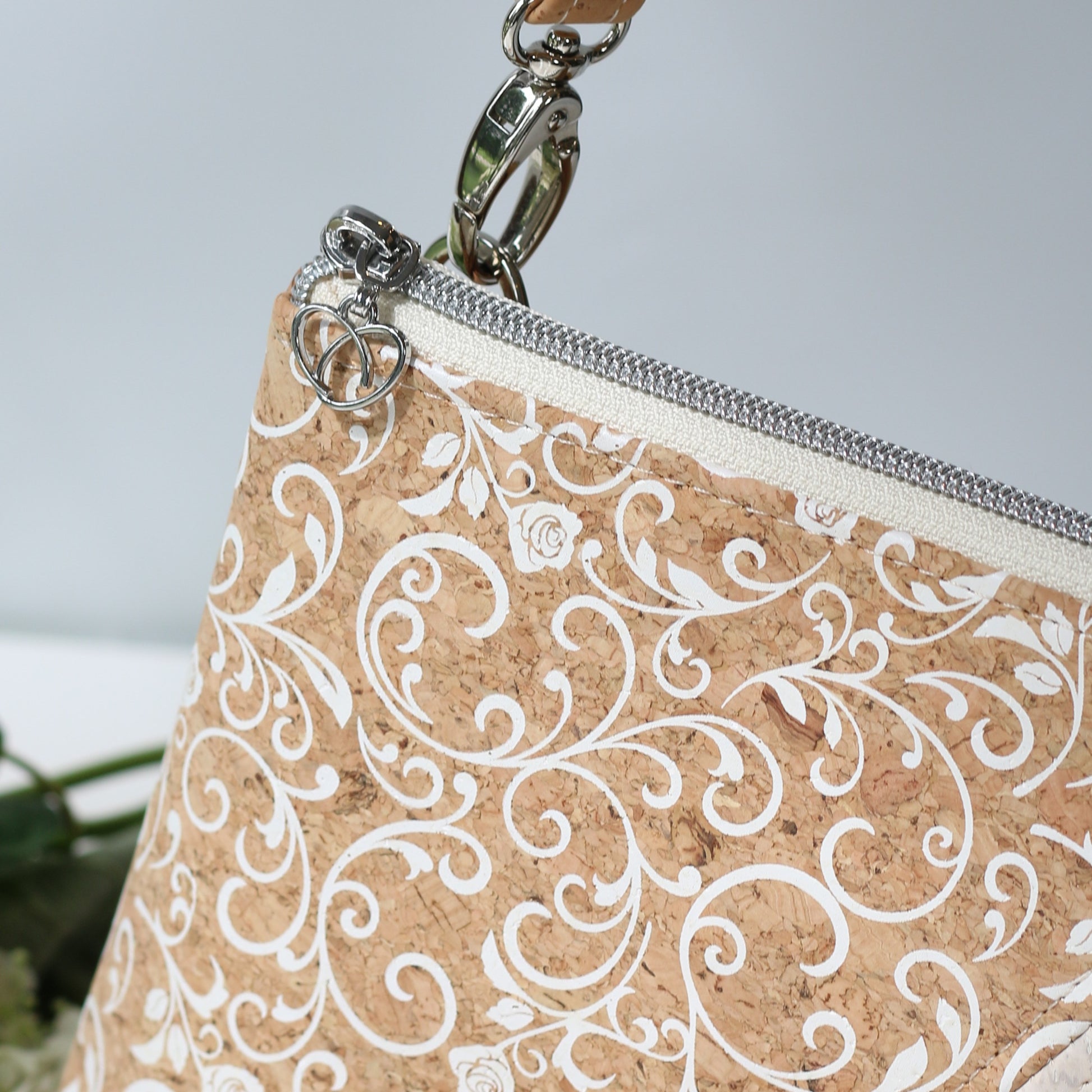 The cork used in this bag is Baroque Elegance and White on the front and Mosaic on the back. The zipper is a nickel finish.