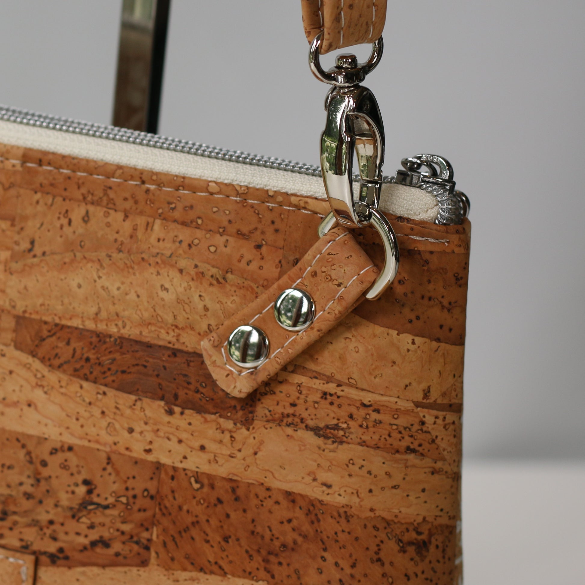 The 1/2" cork strap clips onto the back of the bag and is adjustable, ranging in length from approximately 36" to 56".